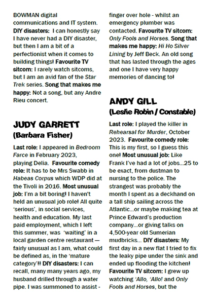 - Set Decoration – Heather Birchenough, Dee Hawes & Rob Cording-Cook assisted by members of the company