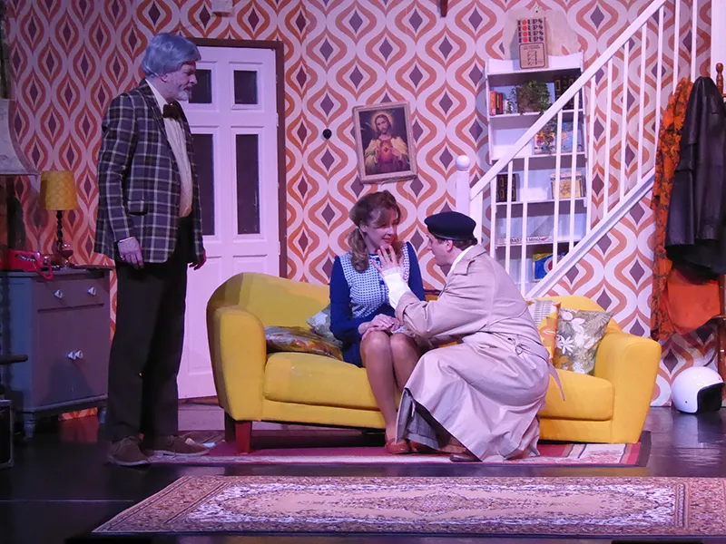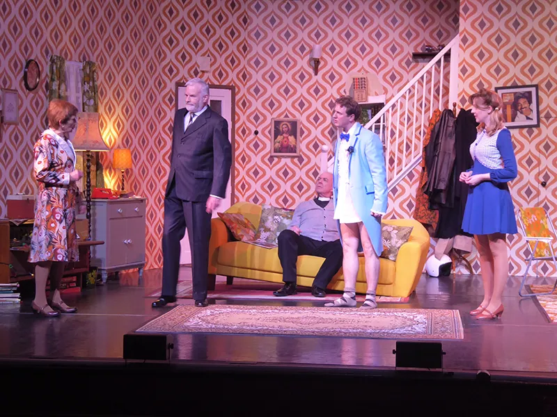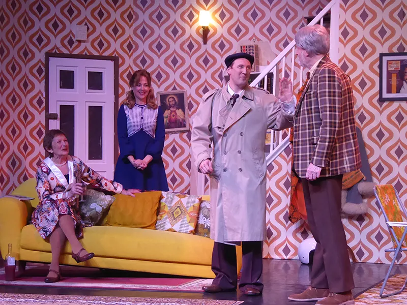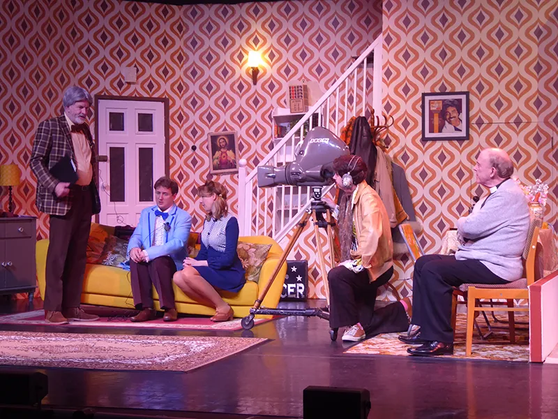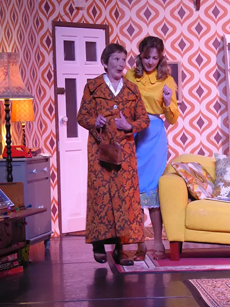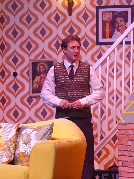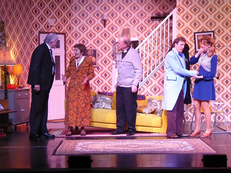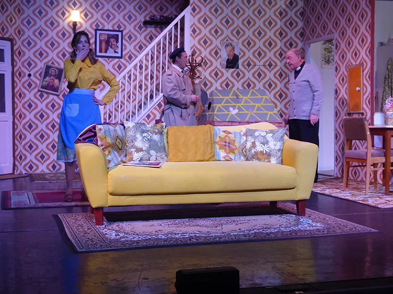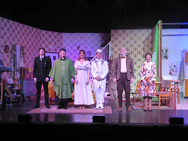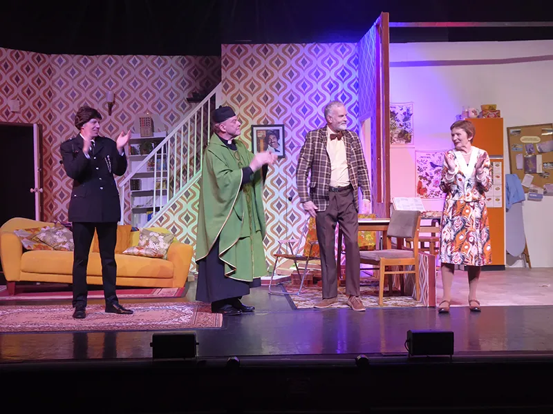Father O’Hara played by Chris Durham shone in his portrayal of the zany a bit dotty priest and bumbled about the stage getting a laugh when he could. Barbara Fisher, Betty’s mother played by Judy Garrett was convincing as a caring mother and very funny as she got drunker and drunker and had to be eventually taken to bed. Richard Neal who was both David Worthington and Terry Luscombe was able to separate his parts well, but I did prefer him as Mr Worthington especially when finding a chair to sit down. Loved Andy Gill as the cameraman he was funny and gay without even speaking.