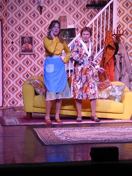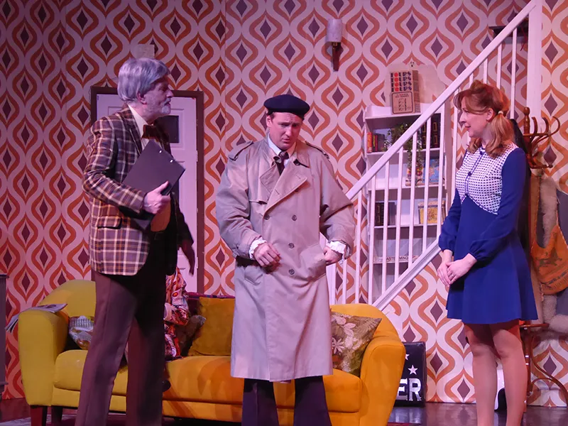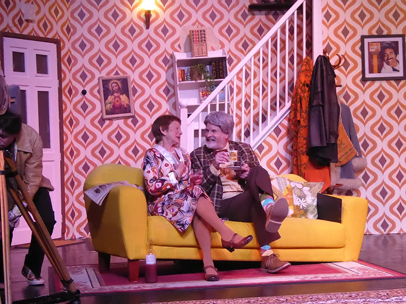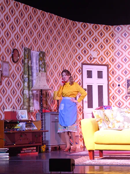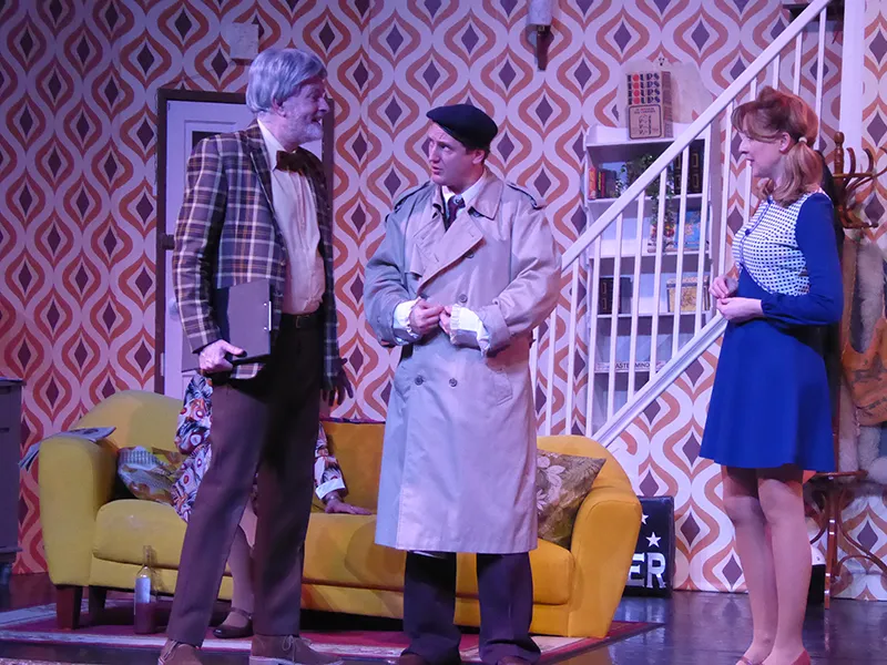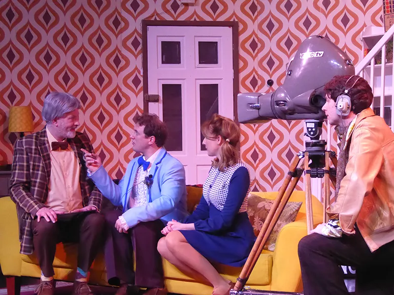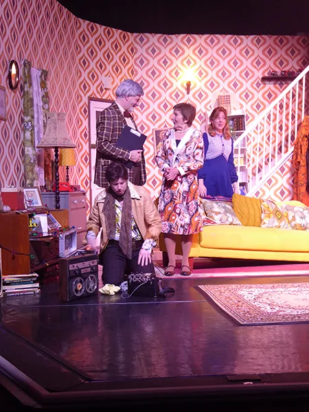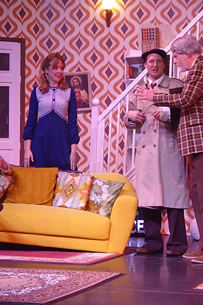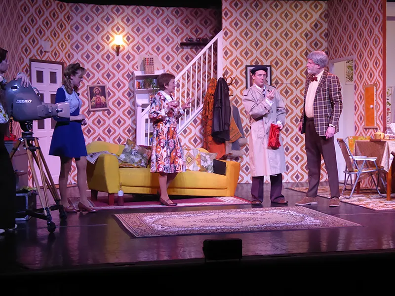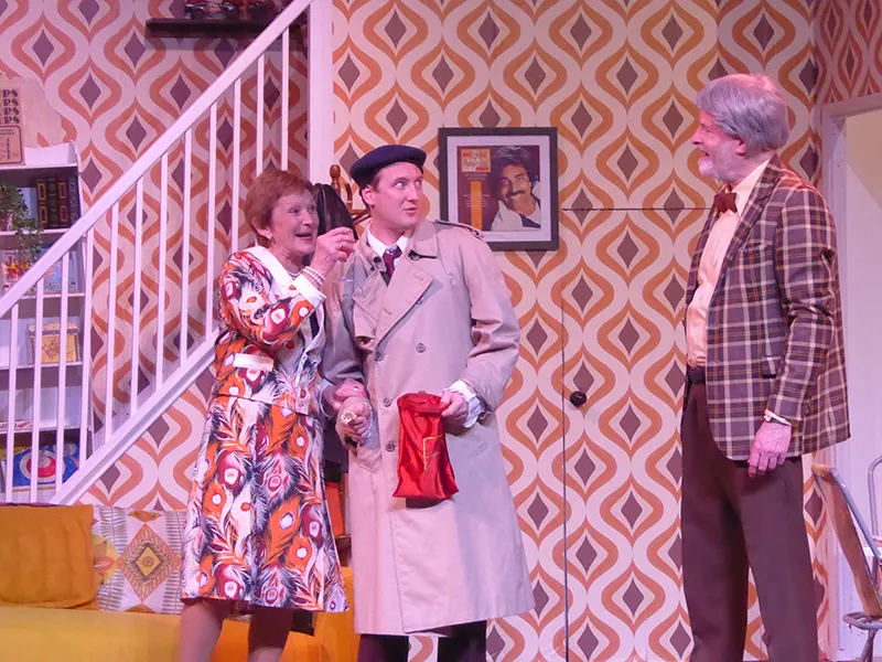 Father O’Hara played by Chris Durham shone in his portrayal of the zany a bit dotty priest and bumbled about the stage getting a laugh when he could. Barbara Fisher, Betty’s mother played by Judy Garrett was convincing as a caring mother and very funny as she got drunker and drunker and had to be eventually taken to bed. Richard Neal who was both David Worthington and Terry Luscombe was able to separate his parts well, but I did prefer him as Mr Worthington especially when finding a chair to sit down. Loved Andy Gill as the cameraman he was funny and gay without even speaking.