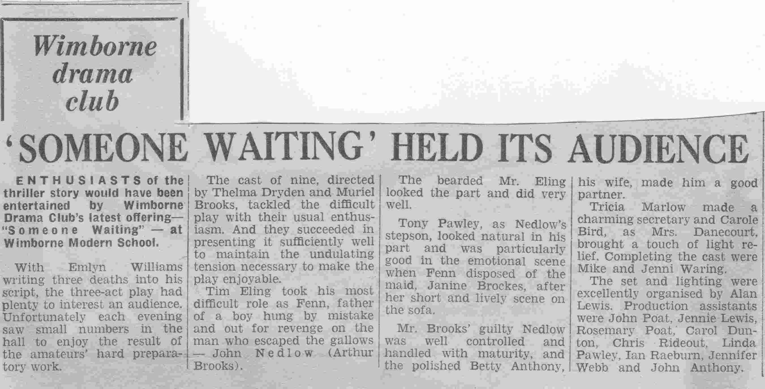 The play was well produced by Thelma Dryden and Muriel Brooks. Stage Manager, Alan Lewis, with his assistants John Poat, Jennie Lewis, Rosemary Poat, Carol Dunton, Chris Rideout, Linda Pawley, Ian Raeburn, Jennifer Webb and John Anthony were responsible for the very effective set.