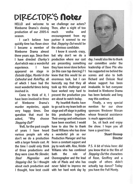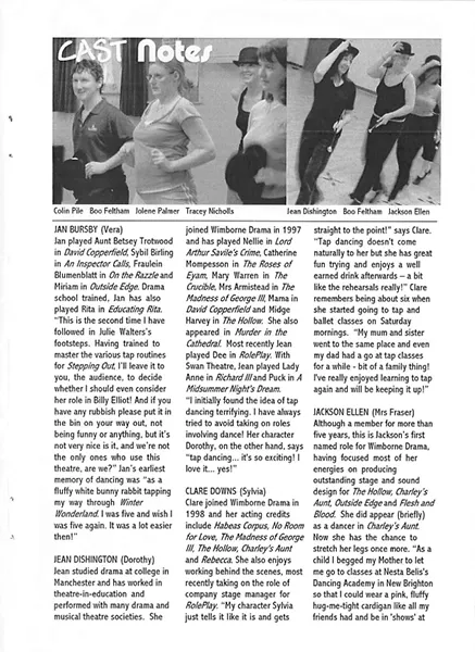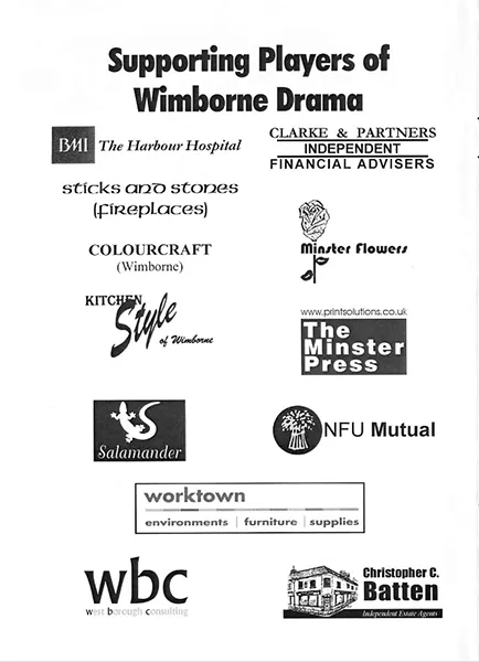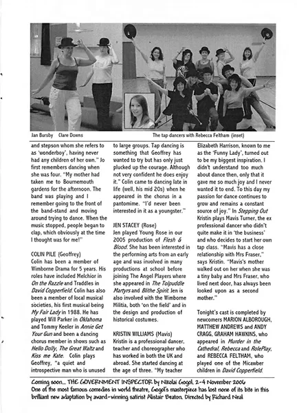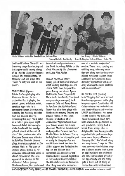2006 Andy Cragg Ashley Thorne Boo Feltham (Dickson) Clare Downs Colin Pile Comedy Dave Williams Graham Hawkins Hazel Ayrton Jackson Ellen (Kingham) Jan Bursby Jan Singfield Jean Dishington Jen Stacey Jolene Palmer Kevin Wilkins Kristin Williams Marion Alborough Matthew Andrews Past Productions Patti Keates Rebecca Feltham Richard Neal Russell Parker Steve Charters Stuart Glossop Tivoli Theatre Tracey Nicholls Wimborne Drama
