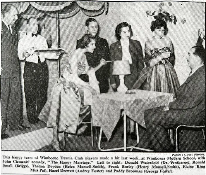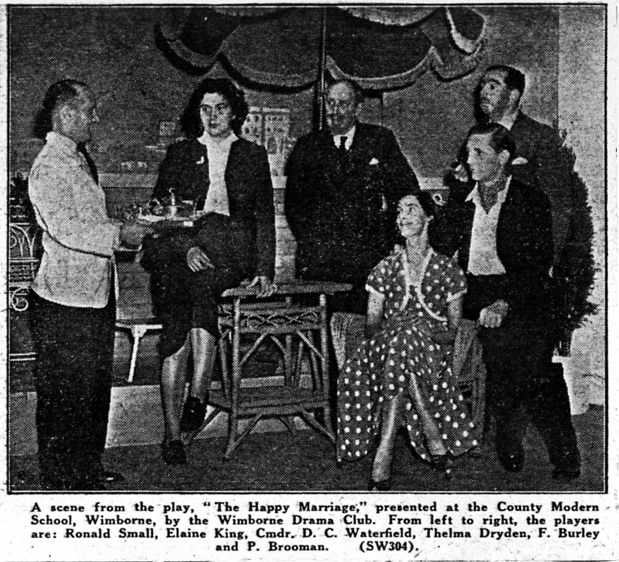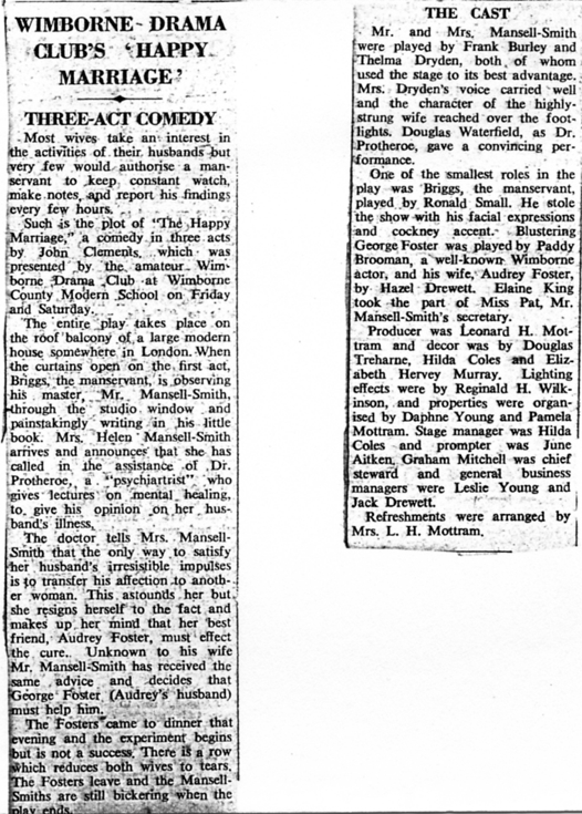 Most wives take an interest in the activities of their husbands but very few would authorise a man-servant to keep constant watch, make notes, and report his findings every few hours. Such is the plot of The Happy Marriage a comedy in three acts by John Clements which was presented by the amateur Wimborne Drama Club at Wimborne County Modern School on Friday and Sarurday.