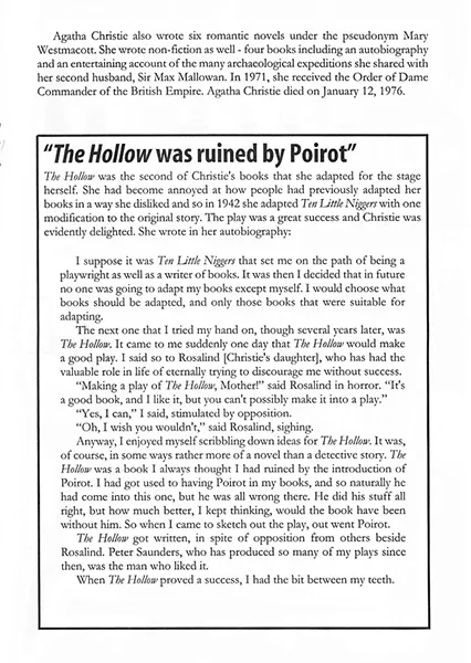 The paly, which opened in cambridge on febriary 5 (by coincidence, St Agatha’s Day) 1951 before transferring to London’s Fortume Theatre, was based on Christie’s 1946 novel of the same name. The book marked the 22nd appearance of Hercule Poirot but she decided to omit her most famous detetctive from the paly script, and described the novel in er autobiograpy as “the one I had ruined with the introduction of Poirot”.