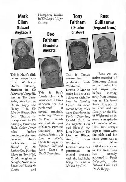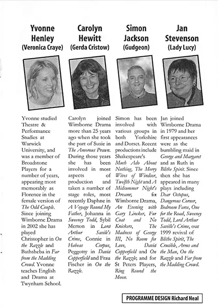 The experienced cast also features Joe Brooks and Jan Stevenson as Sir Henry and Lady Angkatell, at whose country house the play is set; Boo Feltham Henrietta Angkatell; Jean Dishington (Midge Harvey) and Mark Ellen (Edward Angkatell).