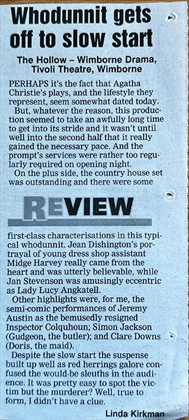 Paul Dodman directed Wimborne Drama’s presentation of The Hollow, a classic whodunnit, with all the ingredients we have come to expect from Christie such as a country house, a dysfunctional family and lots of red herrings.