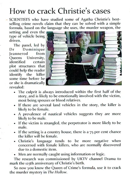 An unhappy game of romantic follow-the-leader explodes into murder one weekend at The Hollow, home of Sir Henry and Lucy Angkatell, arguably Christie’s finest comic grande dame. Dr. Cristow, the Harley Street lothario, is at the center of the trouble when, assembled in one place, we find his dull but devoted wife Gerda, his mistress and prominent sculptor Henrietta and his former lover and Hollywood film star Veronica. Also visiting are Edward and Midge whose romantic assertions are likewise thrown into the mix. As the list of romantic associations grow so does the list of potential suspects when Cristow is shot dead. Nearly everyone has a motive but only one of them did the deed.