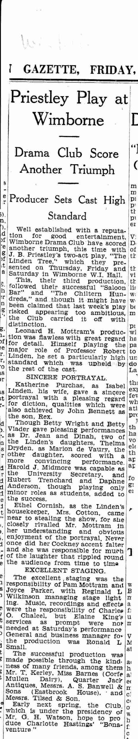 For their third public production, the Wimborne Drama Club have departed from the hilarity of their previous efforts and chosen a delightful family study, “The Linden Tree” by J. B. Priestley, and in doing so, have, I safely say, stamped yet another mark of quality in the annals of the club’s history.