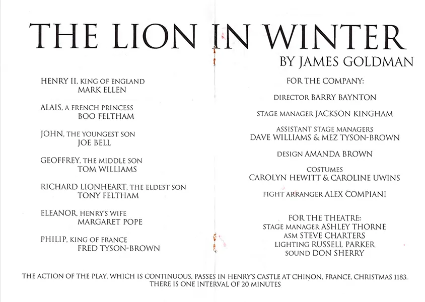 The Lion in Winter concerns the interpersonal dynamics and political wrangling of King Henry; his wife Eleanor, whom he has kept imprisoned in a tower for the past ten years; and their three sons, who are vying for the privilege of being named heir to the English throne.