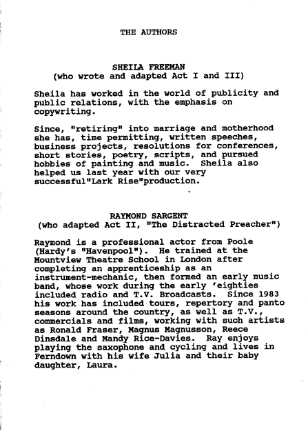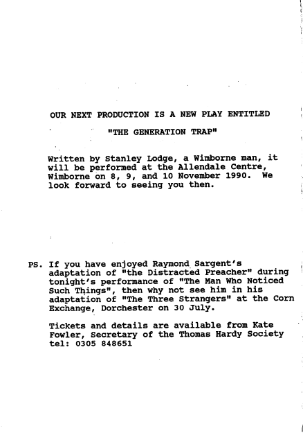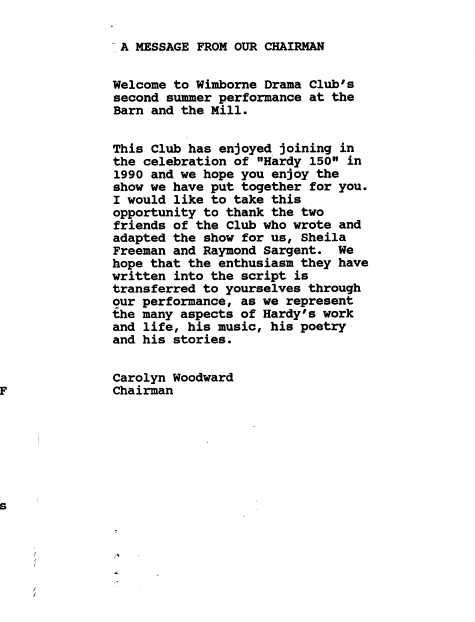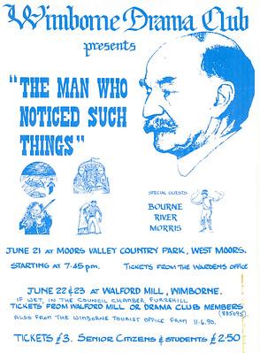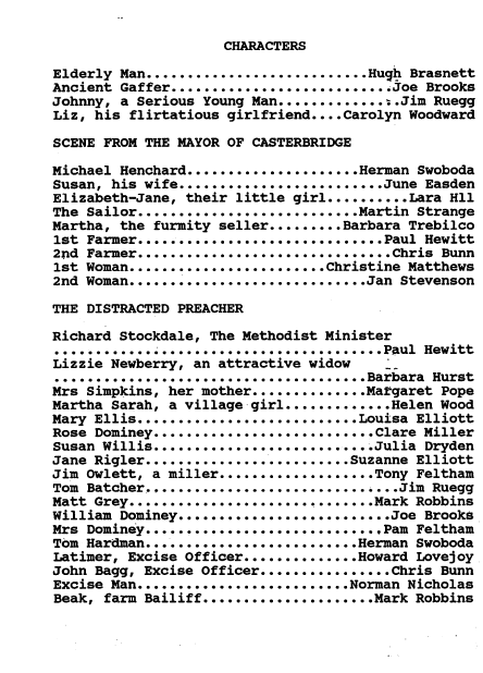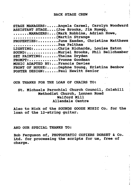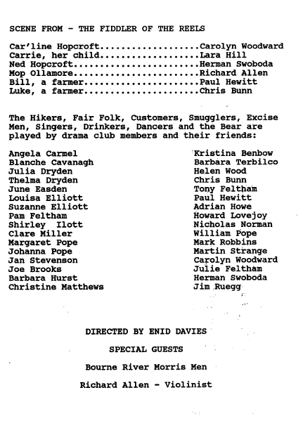 1990 Adrian Howe Angela Carmel Barbara Hurst Barbara Trebilco Blanche Cavanagh Carolyn Hewitt (Woodward)(Young) Chris Bunn Chris Richards Christine Matthews Clare Miller Daphne Young (Anderson) Drama Enid Davies Francis Davies Helen Wood Hermann Swoboda Howard Lovejoy Hugh Brasnett Jan Stevenson Jim Ruegg Joe (Arthur) Brooks Johanna Pope Julia Dryden Julie Feltham (Willis) June Easden (Goulbourn) Kristina Benbow Lara Hill Louisa Elliot Louise Eaton Margaret Pope Mark Robbins Martin Strange Moors Valley Country Park Muriel Brooks Norman Nicholas Open Air Pam Feltham Past Productions Paul Hewitt Phil Bellchamber Richard Allen Shirley Ilott Suzanne Elliot Thelma Dryden Tony Feltham Walford Mill William Pope Wimborne Drama Club Yvonne Goodman