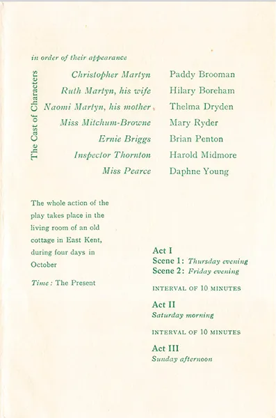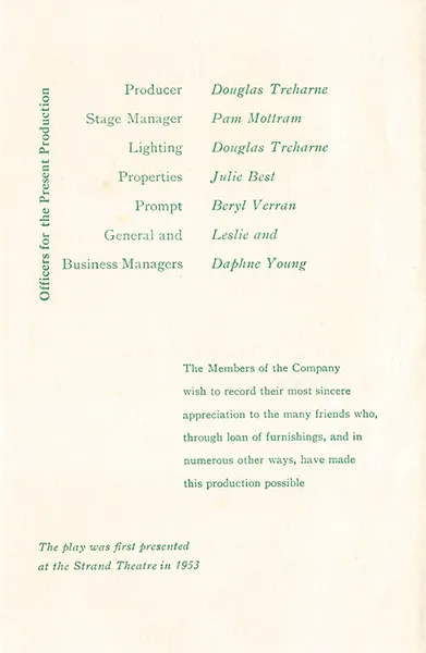 Producer was Douglas Treharne, stage manager Pat Mottram, lighting was Douglas Treharne, properties by Julie Best, general and business managers were Leslie and Daphne Young and the prompter was Beryl Verran.