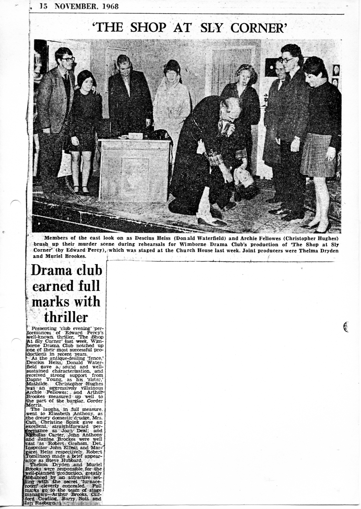 Thelma Dryden and Muriel Brooks were responsible for the well-planned production greatly enhanced by an attractive setting with the secret ‘furnace room’ cleverly concealed. Full marks go to the team of stage managers – Arthur Brooks, Clifford Cowling, Barry Nott and Ian Raeburn.