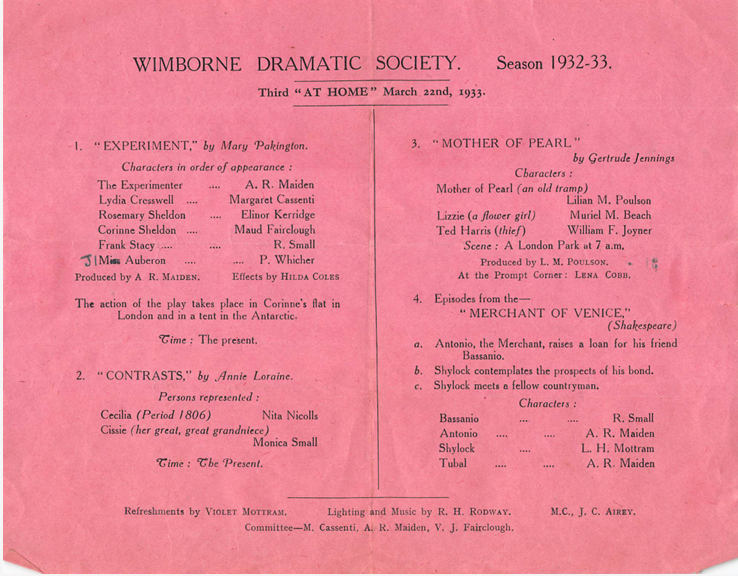 22nd March 1933 @ The Women’s Institute Hall, Wimborne