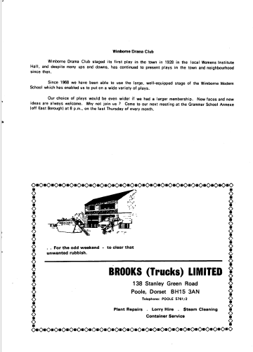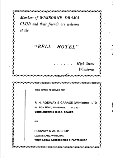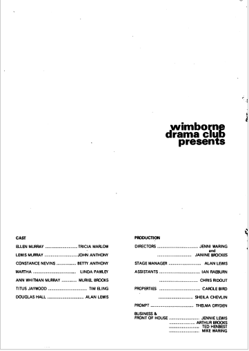 Thelma Dryden prompted; Carole Bird and Sheila Chevlin were responsible for properties; and Jennie Lewis, Arthur Brooks, Ted Henbest and Mike Waring shared business and front of house duties.